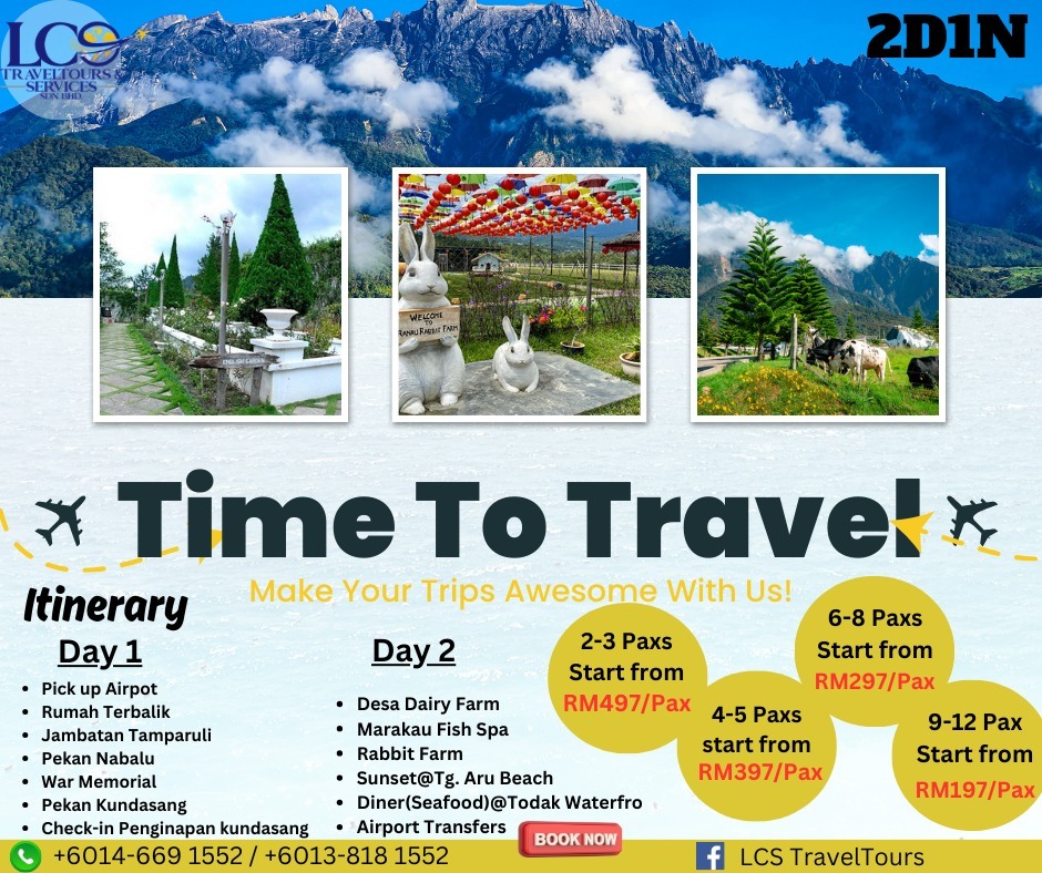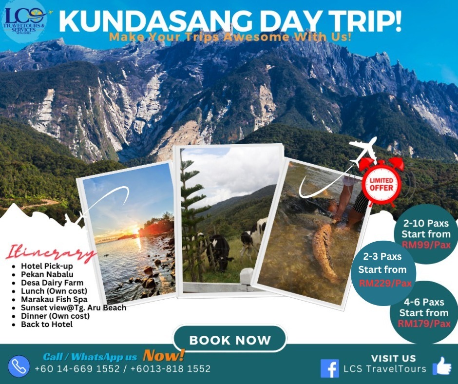 Pekan Nabalu, Desa Dairy Farm, Marakau Fish Spa, and the stunning sunset at Tanjung Aru Beach. Unforgettable sights, experiences, and memories await.